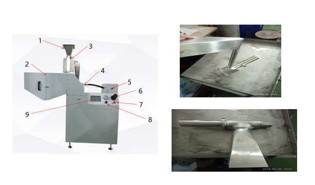 角度可調碰撞室、3D碰撞室、噴槍、氣動震動進料口、收集箱、電控柜、PLC顯示屏
