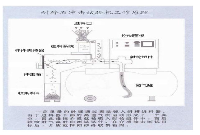 注意:試驗前戴好防護眼罩和防噪耳機!!! (1)首先連接好儲氣罐和沖擊儀 (2)根據(jù)所做標準選擇沖擊箱(角度可調沖擊箱和3D沖擊箱),如果選擇角度可調沖擊箱,則根據(jù)標準要求調節(jié)沖擊角度(45°、54°或90°) 4工作原理 4.1 工作原理圖