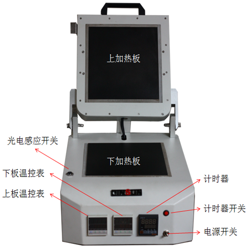安裝好電源線,打開撥子開關(guān),溫控表與計時器亮起,設(shè)置根據(jù)試驗內(nèi)容設(shè)置好試驗溫度,關(guān)閉上蓋板,上下板開始加熱。